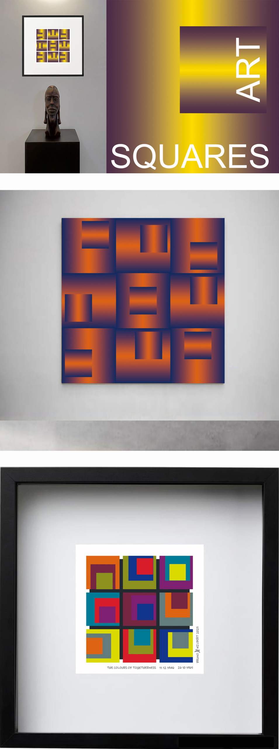 The middle image shows a SQUARES ART object measuring 180 x 180 cm, which was awarded the INTERNATIONAL PRIZE ARTISTS ON THE FRENCH RIVIERA in Nice in 2025.